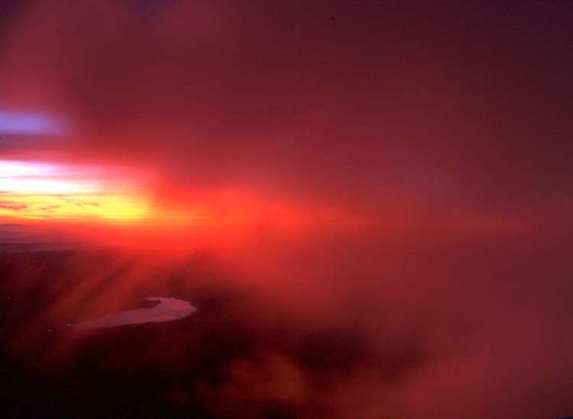 真っ赤に染まったガスがあっという間に山頂を覆う。ガスの切れ間の一瞬のシャッターチャンス。