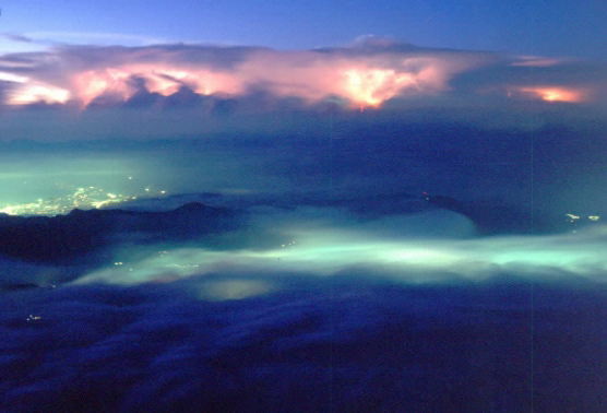 麓の街を覆った雲海も街明かりに照らされて幻想的な山頂夜景になった。