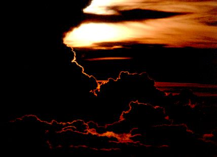 厚い雲群が夕日に迫ってきた。寸光が雲海のフチをなぞっていく。