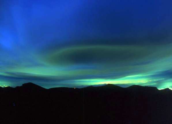 2003.7 剣ヶ峰3776m この場所に立つと火口が大きな口をあけ頂上の形状がとても綺麗に見える。 夕方、ガスの合間に巨大な吊るし雲が見え隠れしていた。急いで小屋(中央の明かり)から剣ヶ峰までゼコゼコしながら到着。 着いたと思うとガスで何も見えない。よくあることなのだが、測候所の職員に変な目で見られながら真っ暗な中、三脚を据えて待った。 1時間後願いが届き!巨大UFO?の出現。露出に注意しながら数カット押すことができた。