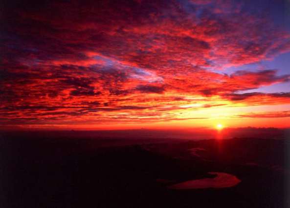 真っ赤に染まった朝焼け。まさしく山頂〜神々の世界。
