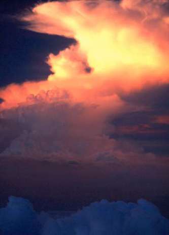 東の空に夕日を浴びて染まり行くかなとこ雲(積乱雲)。